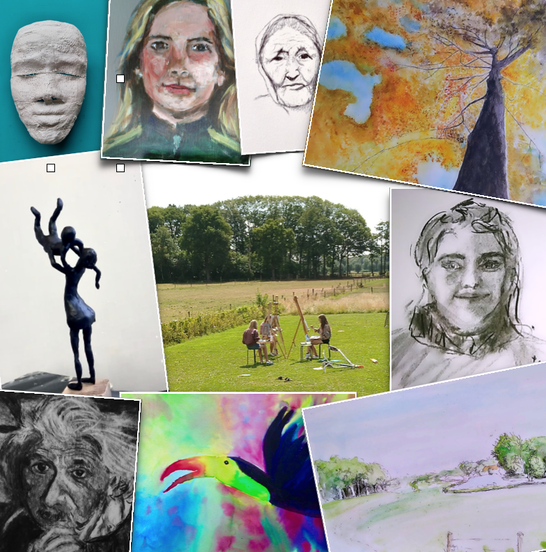 Er is veel vrije keuze met welk materiaal en welk onderwerp je aan de slag gaat. Je kunt zowel in het platte vlak als ruimtelijk werken, met houtskool, pastelkrijt, acryl, aquarel, metaaldraad, klei etc. etc. (bijna) alles kan!